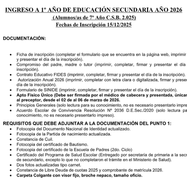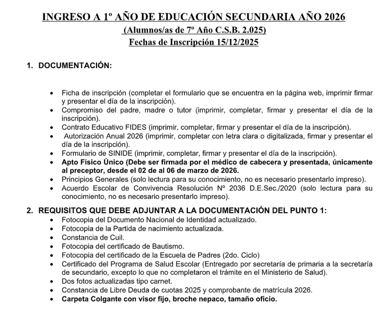 INGRESO A 1º AÑO DE EDUCACIÓN SECUNDARIA AÑO 2026